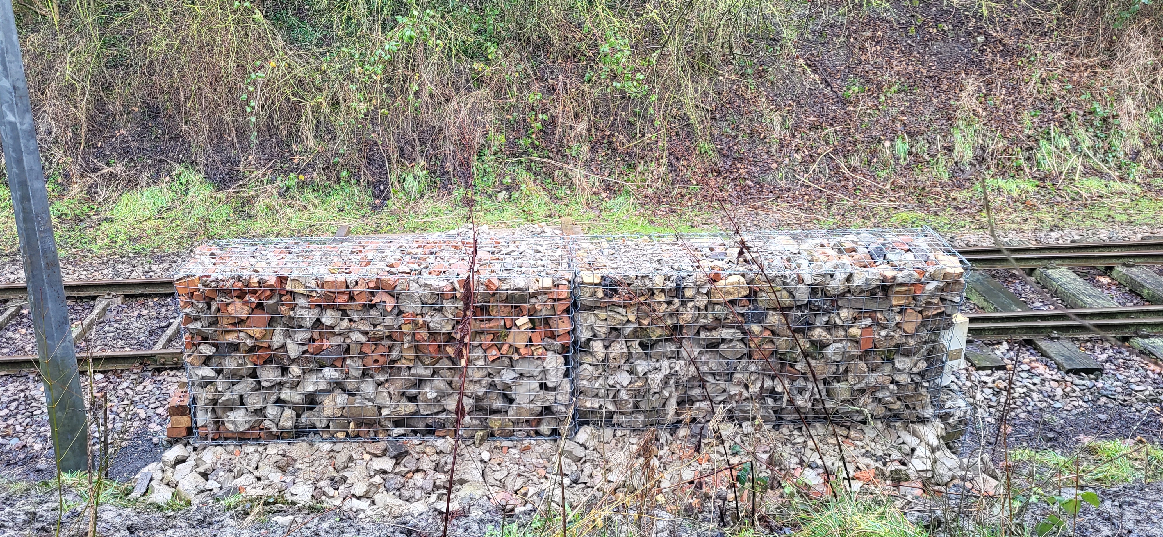 We think there is about eight and a half tons of rock material in the gabion baskets/cages and another ton and a half behind it - all moved by hand!