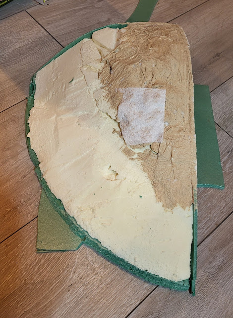 It was then time to think about getting some greenery on the bare hills. Most people would reach for static grass or flock powders but I wanted a more wild unkempt look so I naturally turned to hanging basket liner! Not what you would think of to model grass but its use has been described before in the model rail press and I have used it before too. Both hills had full strength PVA brushed on them to which pieces of hanging basket liner were pressed into.