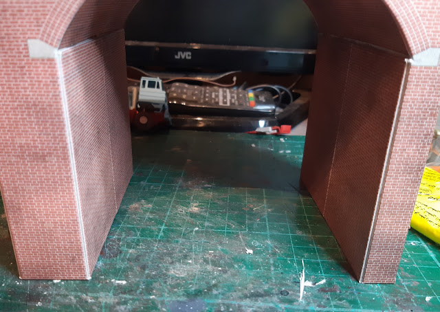 One of the issues with a card kit is that the edges generally show the white of the card they are made of because the card is scored on the outside to enable a sharp edge to be created. Anything white tends to stick out on a model so the way to hide it is to use an artists pencil in a suitable brick colour and run it along the edges. The 'before' and 'after' photos below show the results.