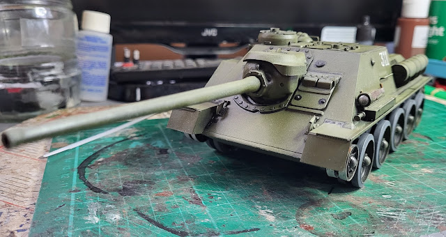 Not the type of dusting on Mrs. Woody's chore list but a bit of weathering on the Italeri SU-100 assault gun with a dusting of powders. Firstly though one of the things that has worried me about this kit is the fit of the tracks. They are rubber but seem to have little flexibility. Luckily my trial fit showed that they did fit. Just need to finish weathering them before they are fitted permanently.